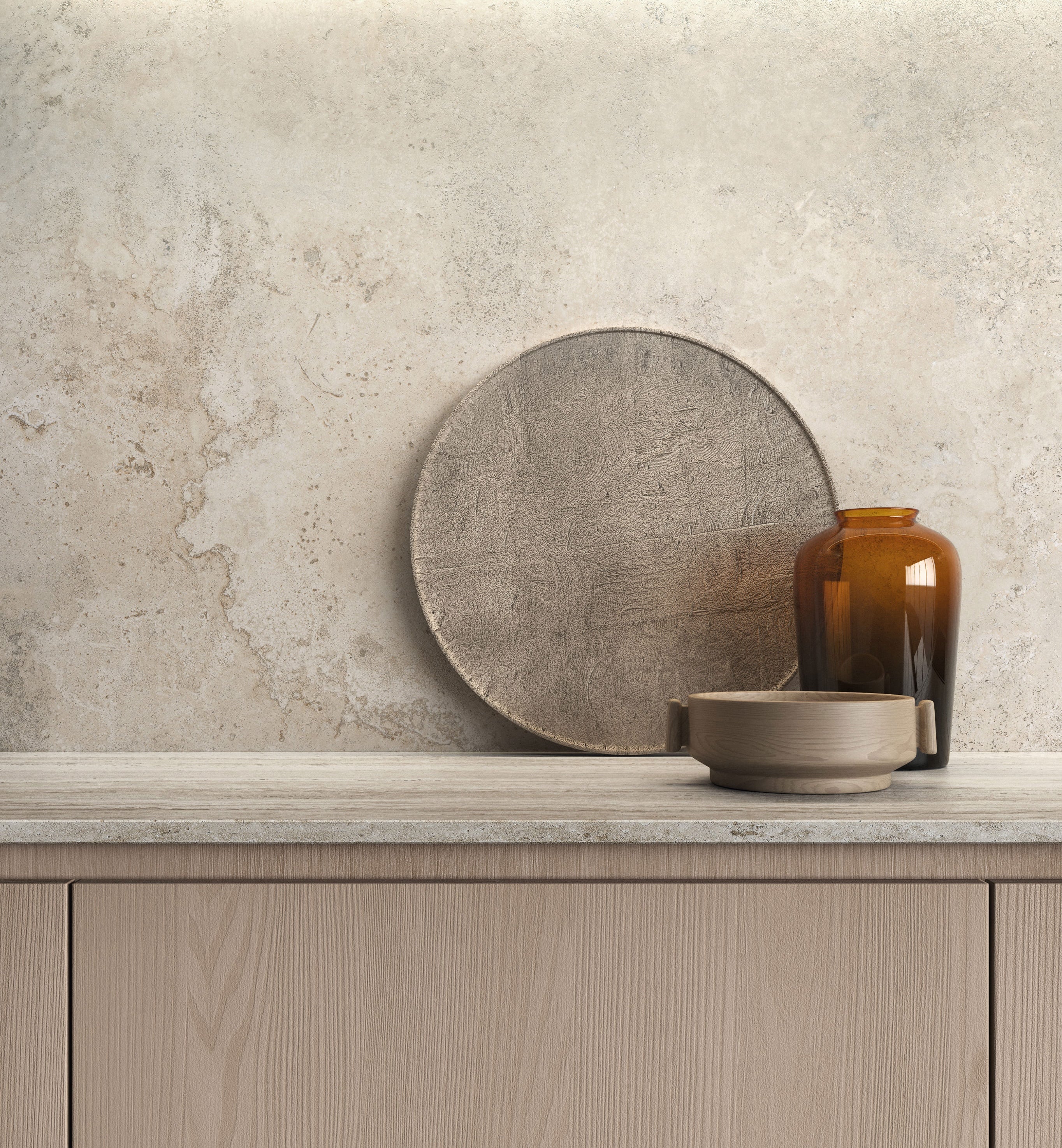 The Traviata Collection offers a neutral palette of porcelain in a variety of rich surface textures. Fabricated in Italy, Traviata is crafted with precision to faithfully recreate the beauty and tactile depth of travertine. Traviata Aurum Falda has a light beige coloration with notes of cream and gray, and recreates the look of cross cut natural stone.