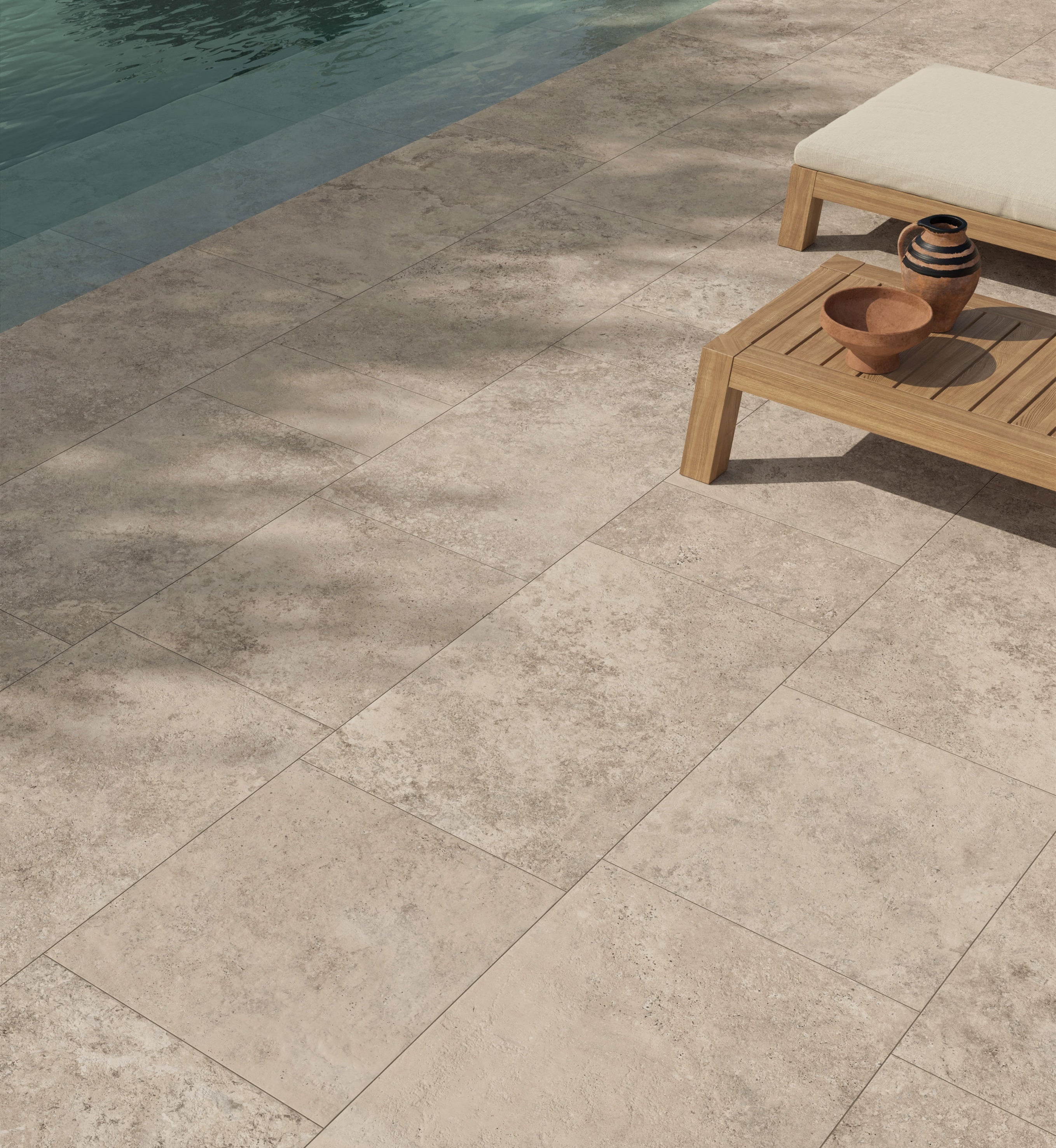 The Traviata Collection offers a neutral palette of porcelain in a variety of rich surface textures. Fabricated in Italy, Traviata is crafted with precision to faithfully recreate the beauty and tactile depth of travertine. Traviata Tibur Falda has a nuanced medium beige coloration and recreates the look of cross cut natural stone.