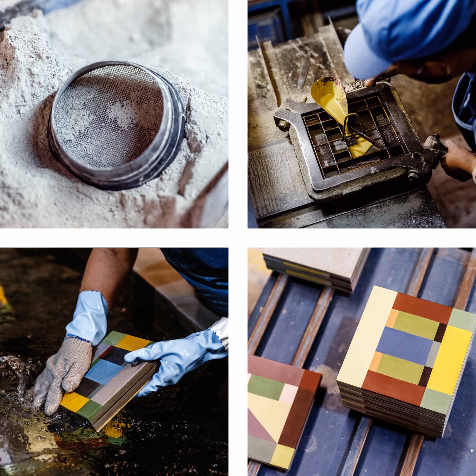 Created in collaboration with LA-based design firm Commune, the decorative cement tiles in the Abstrakt collection are handmade in Vietnam using the same artisanal techniques that have been passed down for centuries. Colors are mixed using cement, stone powder and pigment and then hand-poured into patterned molds affixed to a tile base. The mold is then removed, and a mixture of cement and sand is added to strengthen the bond between layers before the tile is hydraulically pressed. The pressed tiles are then racked and, lastly, cured underwater for 24 hours before finishing. This labor-intensive, multistep process produces unique tiles with unparalleled durability, character and beauty, while honoring a long, rich history of traditional craftsmanship.