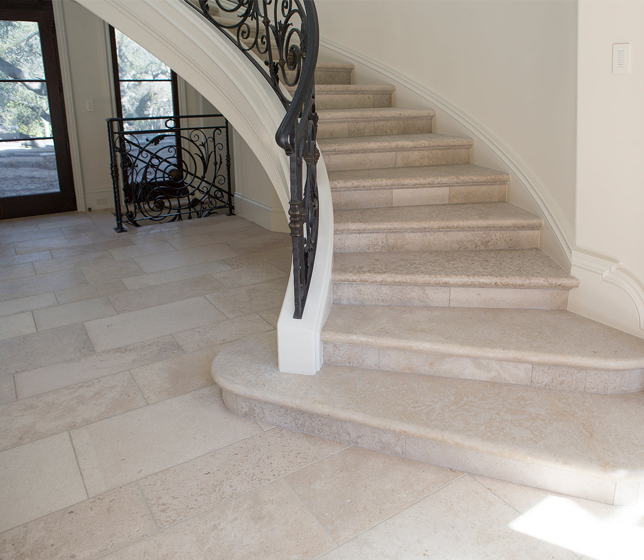 A fairly consistent French limestone with light-to-medium cream tones and cooler undertones. It has an interesting variation of shelling and natural veining with chiseled edges and an aged, textured surface.